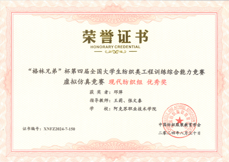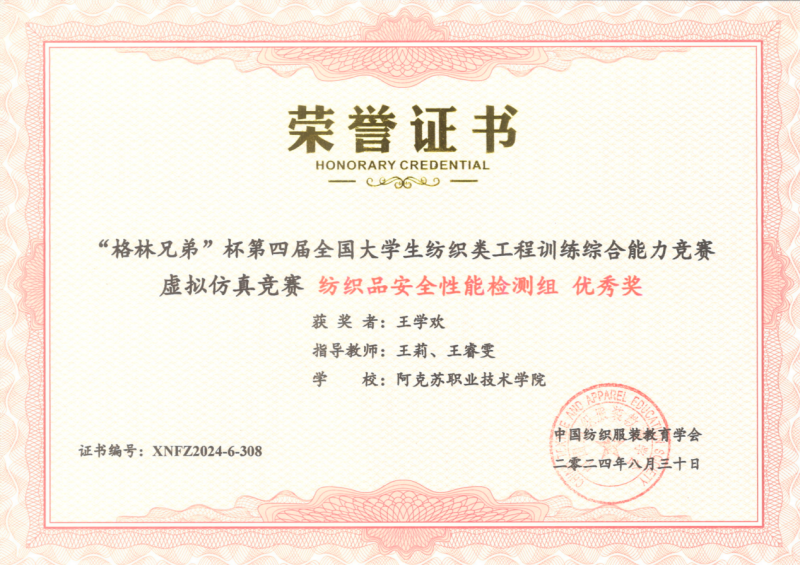 7 | 2024年 8月 | “格林兄弟”杯第四届全国大学生纺织类工程训练综合能力竞赛虚拟仿真竞赛《纺织品安全性能检测组》 | 中国纺织服装教育学会 |