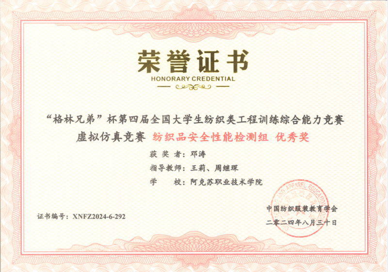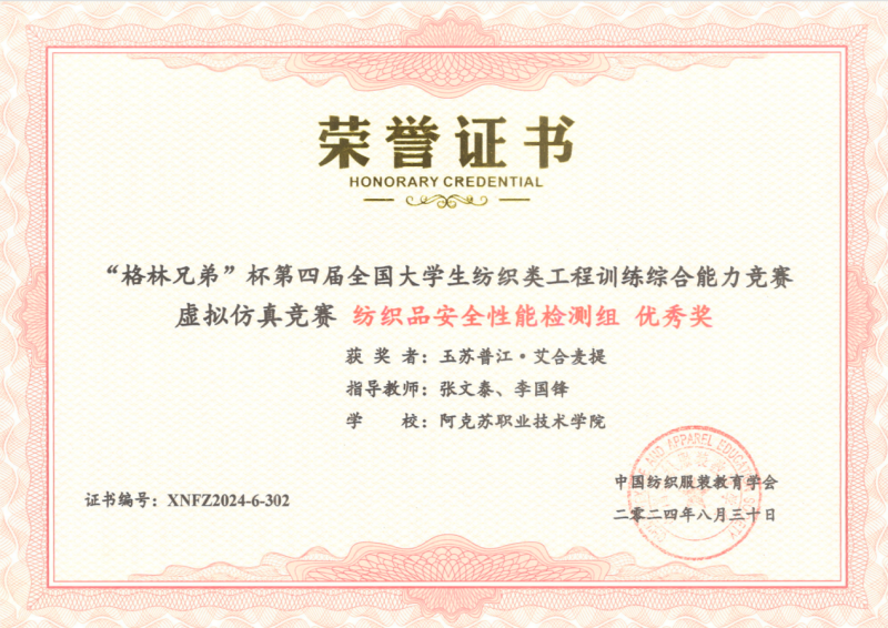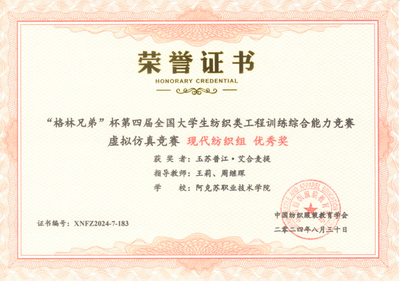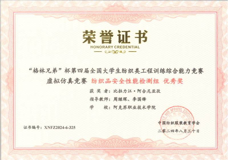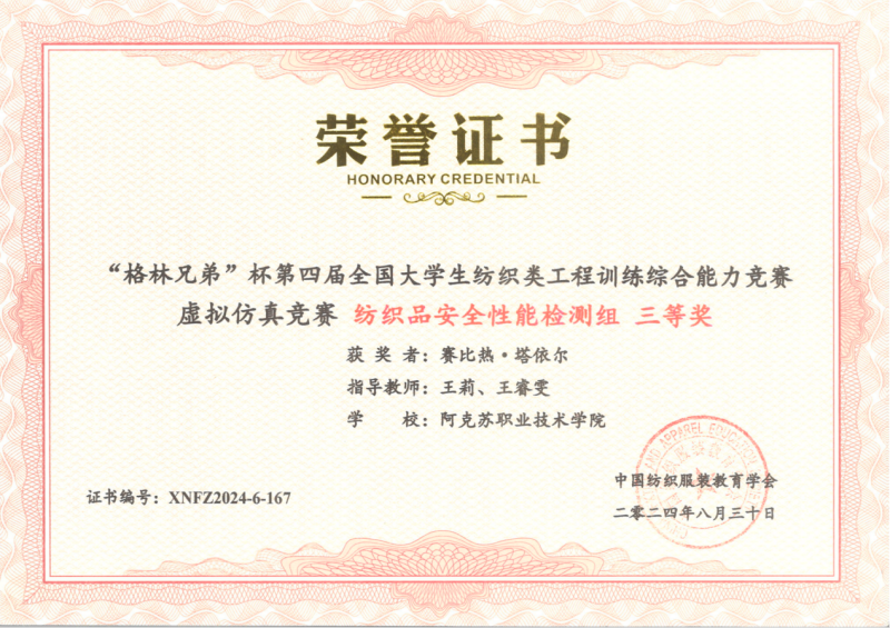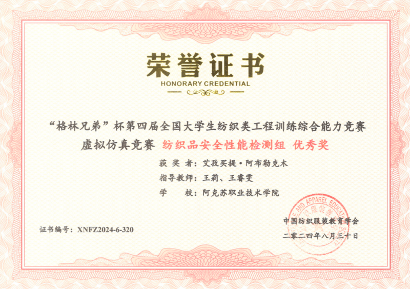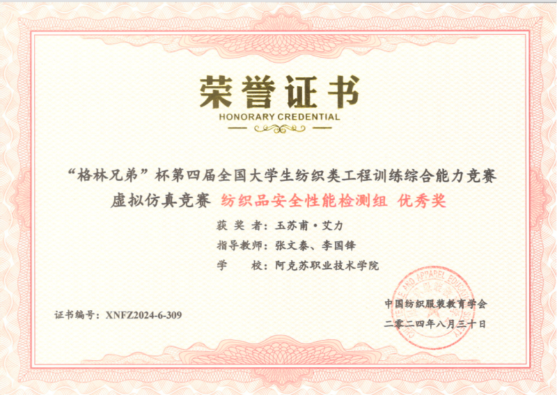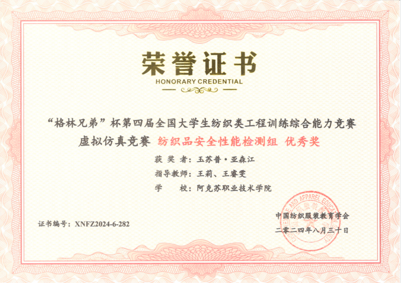 19 | 2024年 8月 | “格林兄弟”杯第四届全国大学生纺织类工程训练综合能力竞赛虚拟仿真竞赛《纺织品安全性能检测组》 | 中国纺织服装教育学会 | 优秀奖 | 玉苏甫·艾力 |