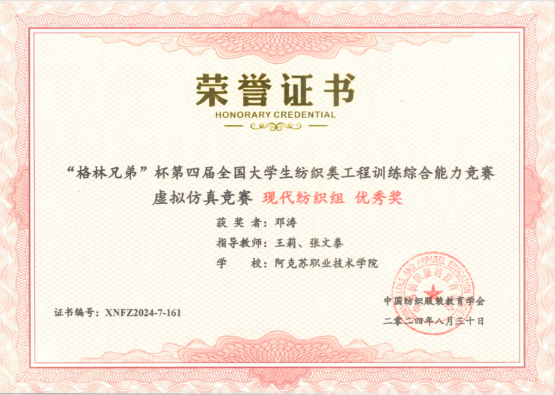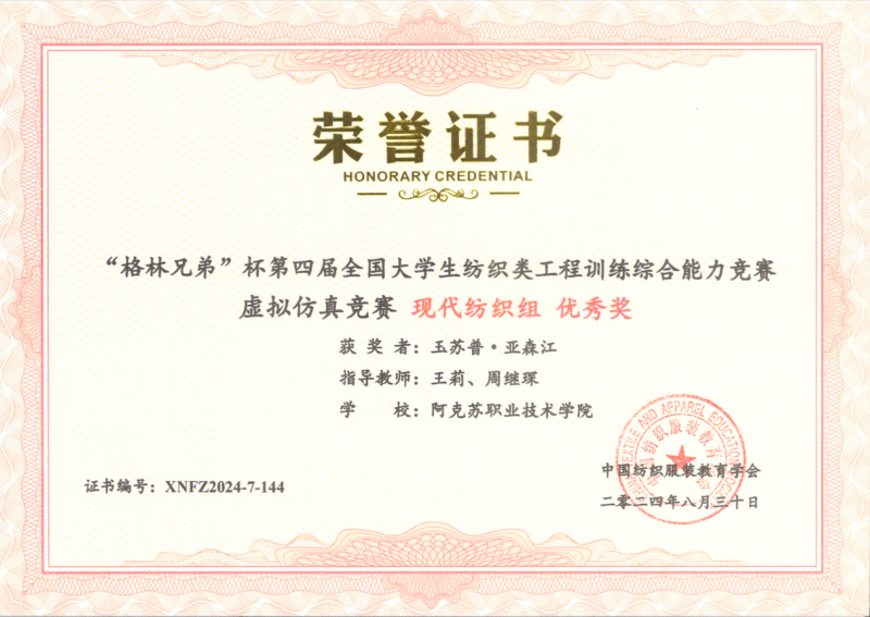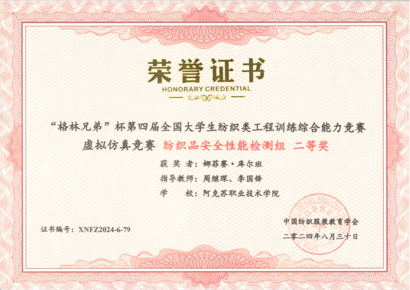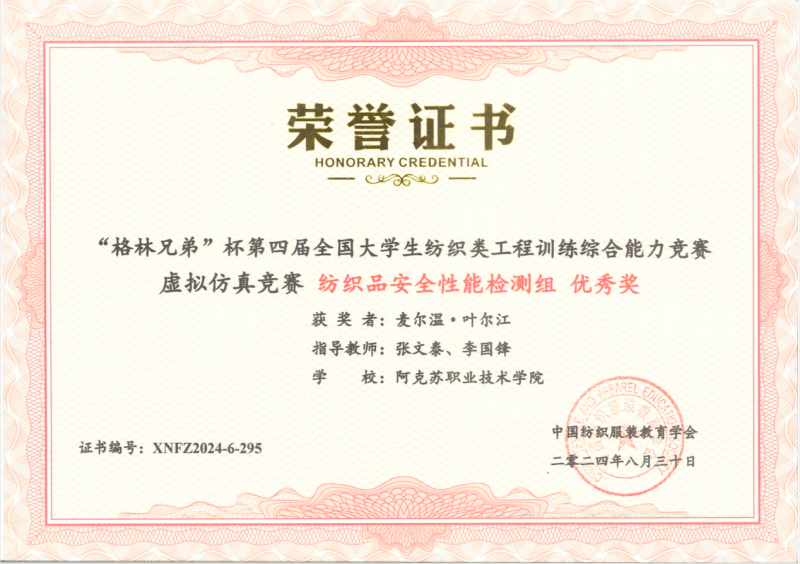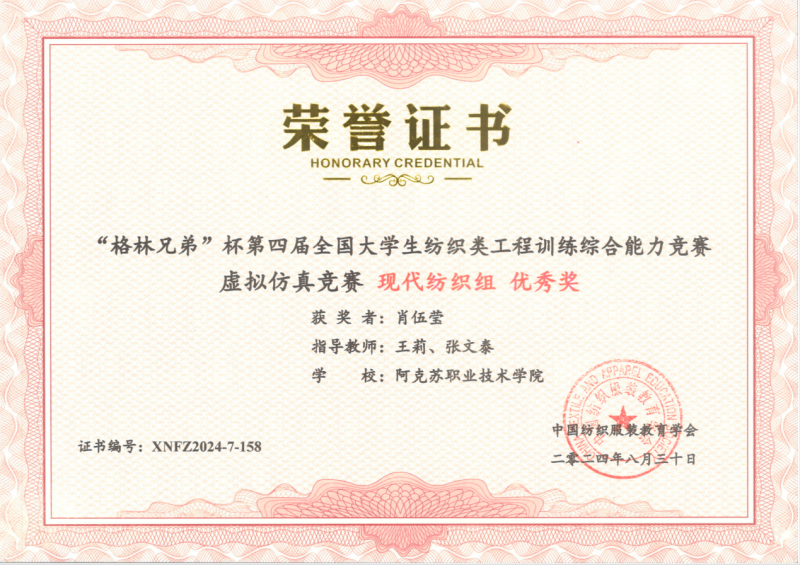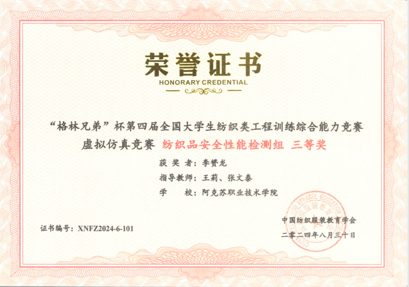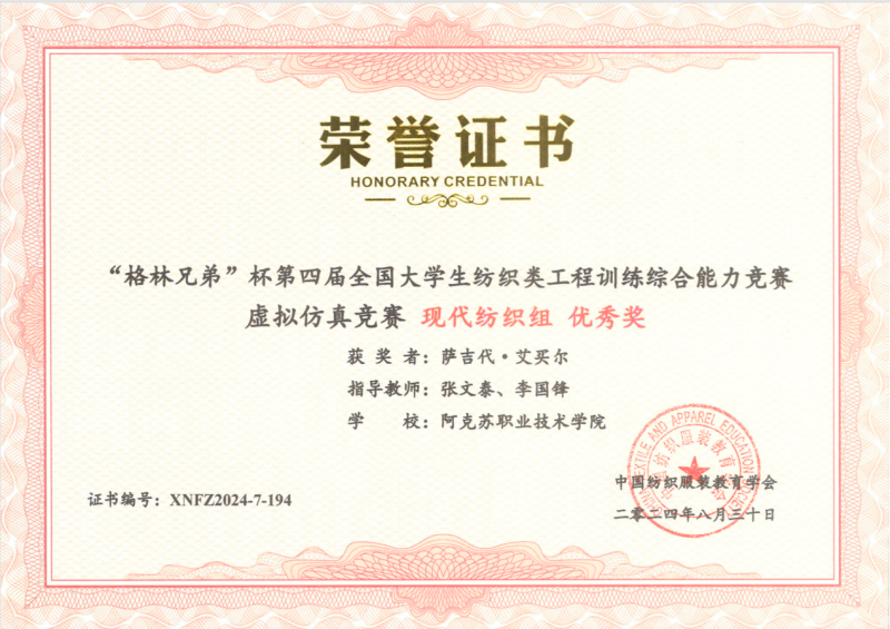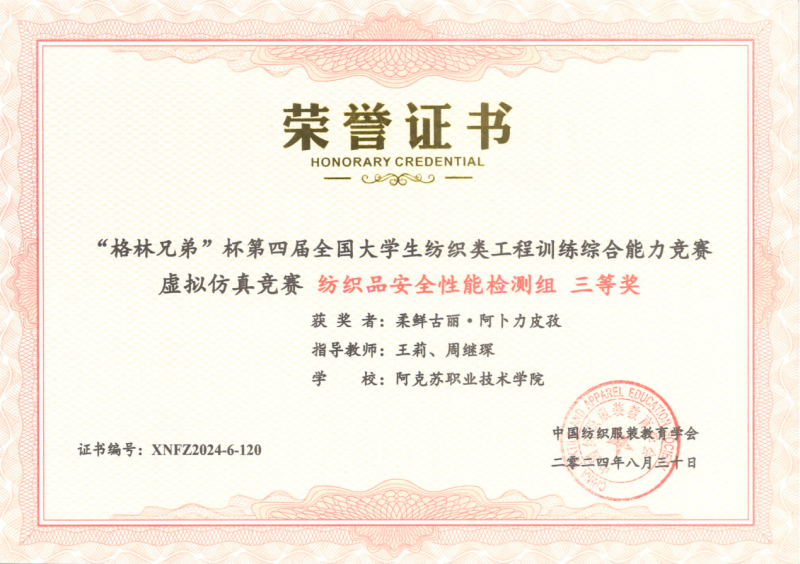 19 | 2024年 8月 | “格林兄弟”杯第四届全国大学生纺织类工程训练综合能力竞赛虚拟仿真竞赛《纺织品安全性能检测组》 | 中国纺织服装教育学会 | 优秀奖 | 玉苏甫·艾力 |