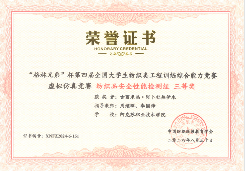 12 | 2024年 8月 | “格林兄弟”杯第四届全国大学生纺织类工程训练综合能力竞赛虚拟仿真竞赛《纺织品安全性能检测组》 | 中国纺织服装教育学会 |