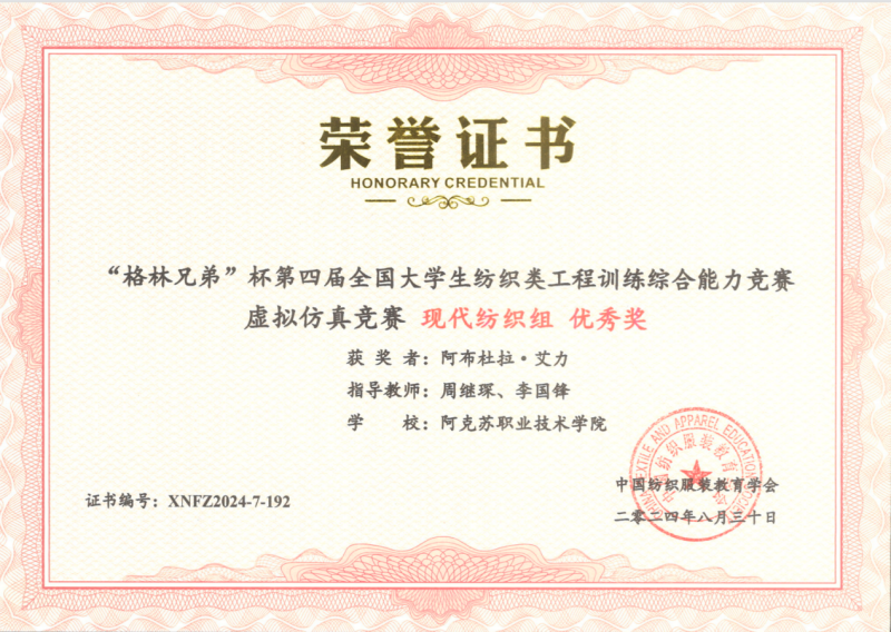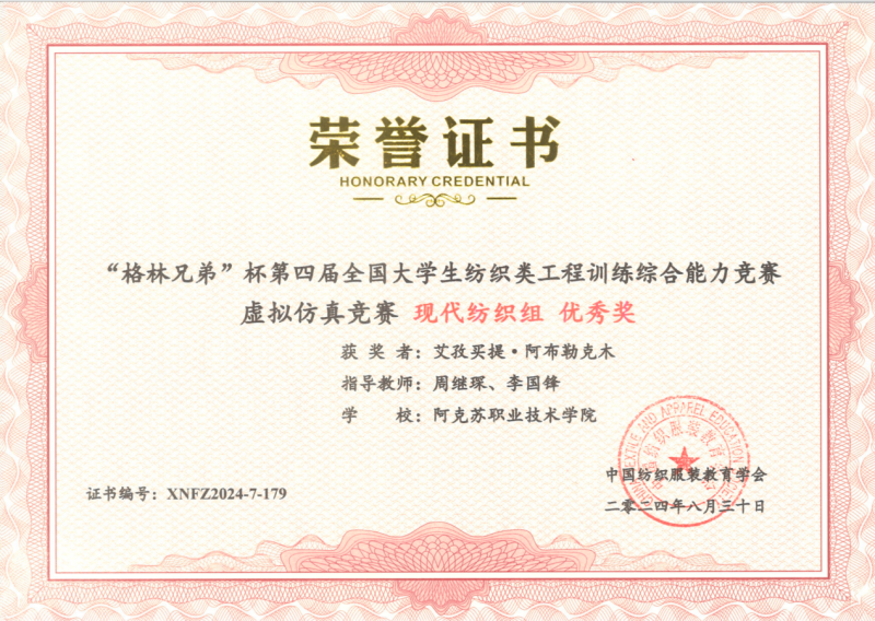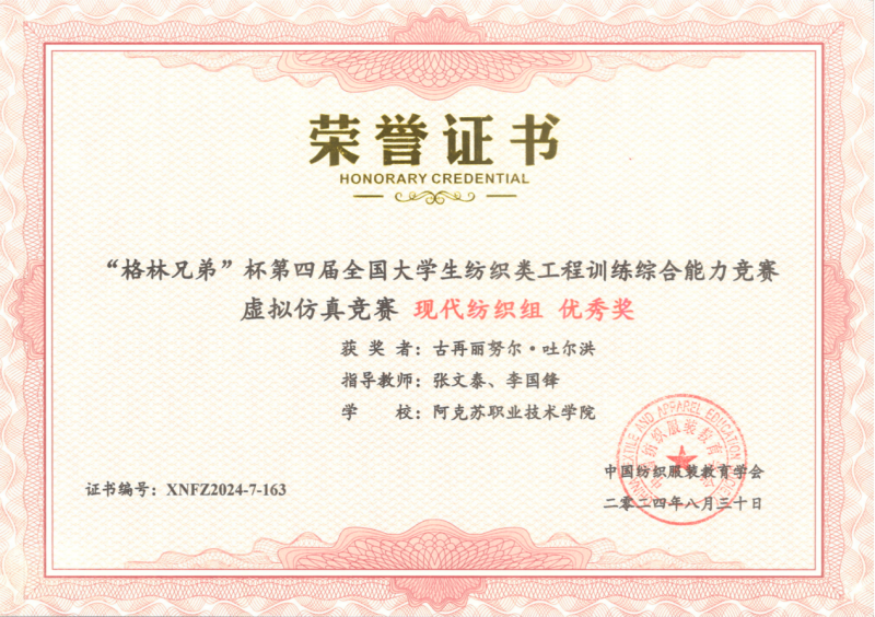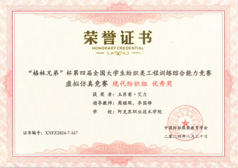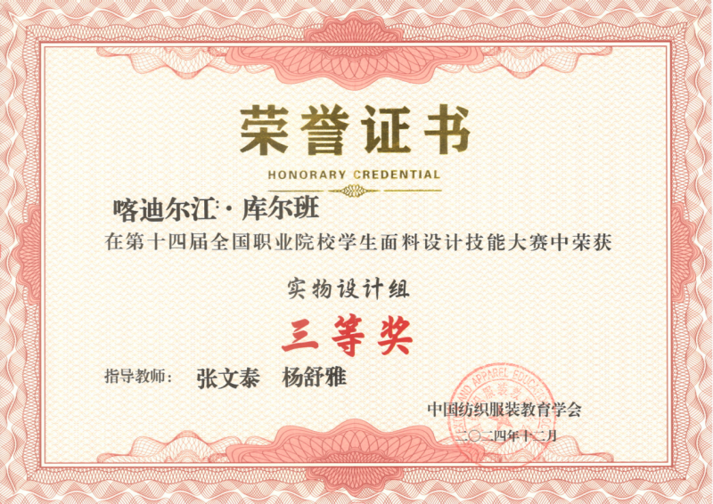 33 | 2024年 12月 | 第十四届全国职业院校学生面料设计技能大赛 | 中国纺织服装教育学会 | 三等奖 | 喀迪尔江·库尔班 | 张文泰 杨舒雅 |