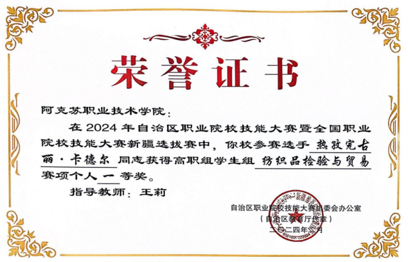 1 | 2024年 2月 | 2024年自治区职业院校技能大赛暨全国职业院校技能大赛新疆选拔赛纺织品检验与贸易学生组 |