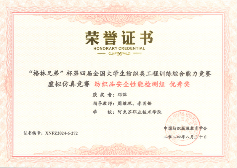 13 | 2024年 8月 | “格林兄弟”杯第四届全国大学生纺织类工程训练综合能力竞赛虚拟仿真竞赛《纺织品安全性能检测组》 | 中国纺织服装教育学会 |