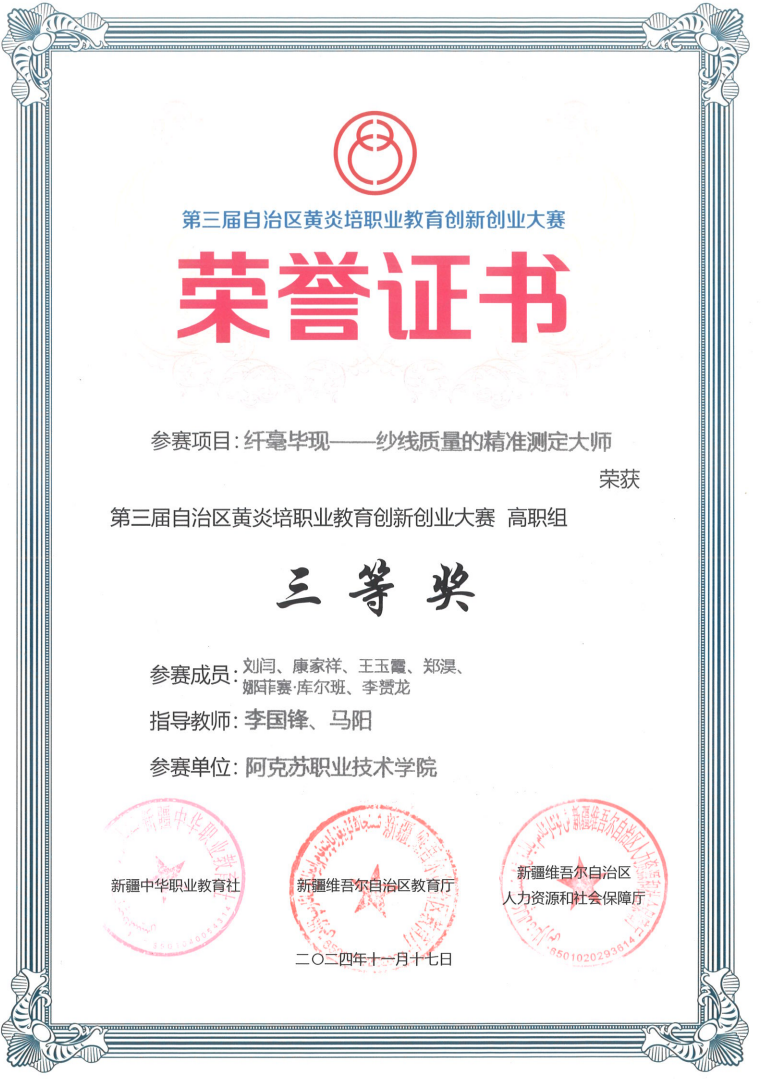 5 | 2024年 11月 | 第三届自治区黄炎培职业教育创新创业大赛: 纤毫毕现——纱线质量的精准测定大师 | 自治区级