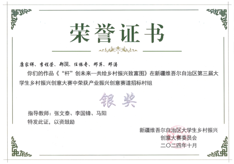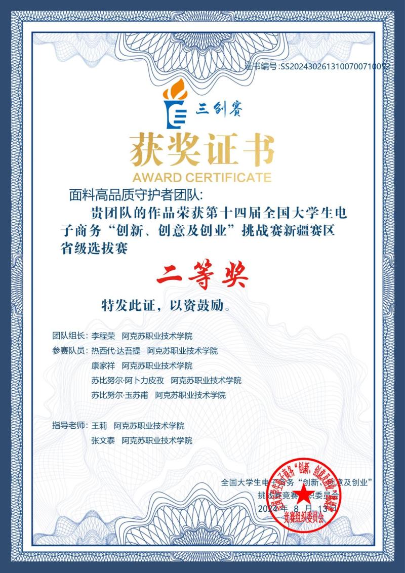 13 | 2024年 8月 | 第十四届全国大学生电子商务“创新、创意及创业”挑战赛新疆赛区省级选拔赛:面料高品质守护者团队 | 自治区级 | 二等奖 | 李程荣、热西代·达吾提、康家祥、苏比努尔·阿卜力皮孜、苏比努尔·玉苏甫 | 王莉 张文泰 |