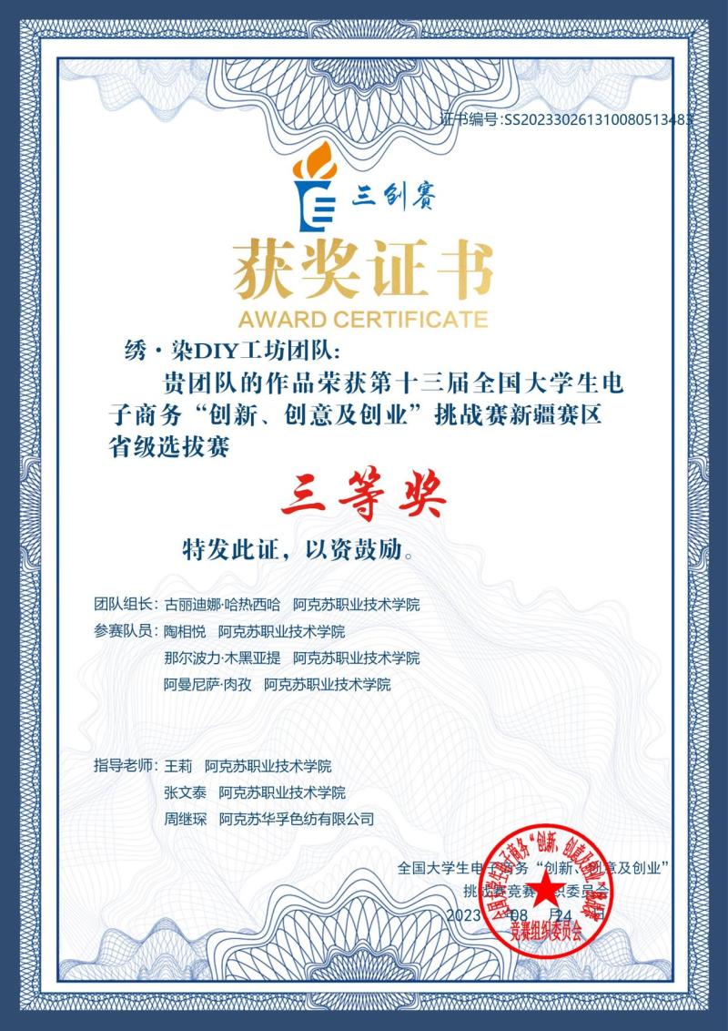 9 | 2023年 8月 | 第十三届全国大学生电子商务“创新、创意及创业”挑战赛新疆赛区省级选拔赛:绣·染DIY工坊团队 | 自治区级 | 三等奖 | 古丽迪娜·哈热西哈、陶相悦、那尔波力·木黑亚提、阿曼尼萨·肉孜 | 王莉 张文泰周继琛 |