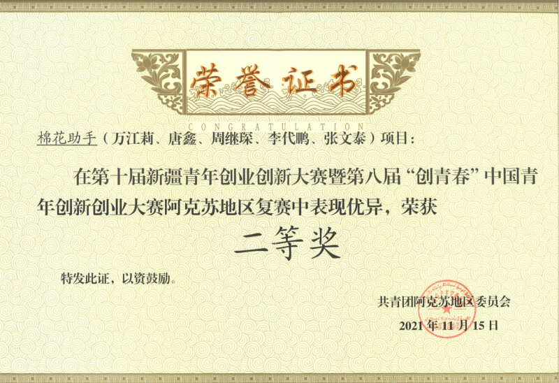 16 | 2021年11月 | 第十届新疆青年创业创新大赛暨第八届“创青春”中国青年创新创业大赛阿克苏地区复赛 | 共青团阿克苏地区委员会 | 二等奖