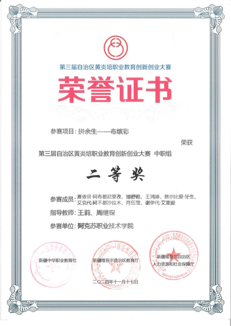 3 | 2024年 11月 | 第三届自治区黄炎培职业教育创新创业大赛: 拼余生——布缤彩 | 自治区级