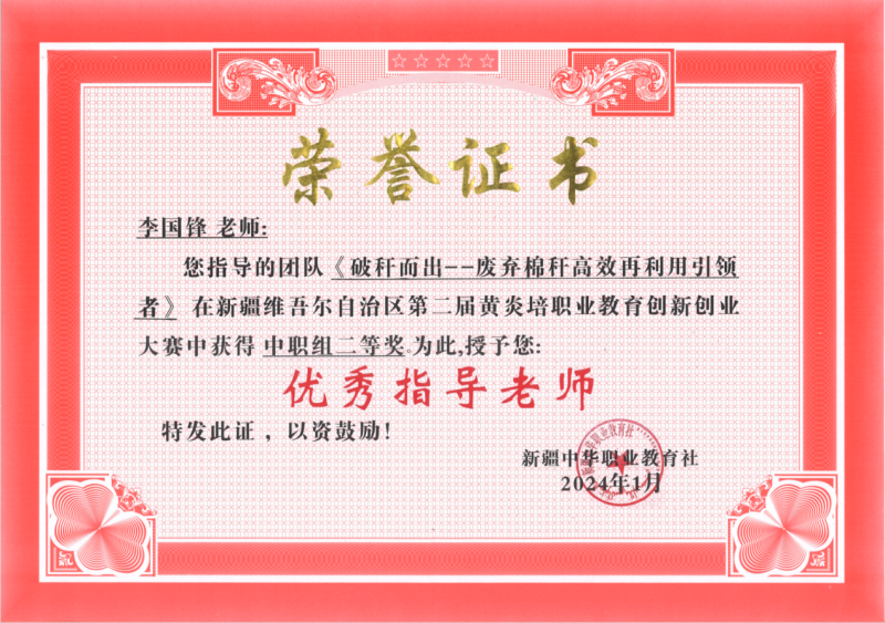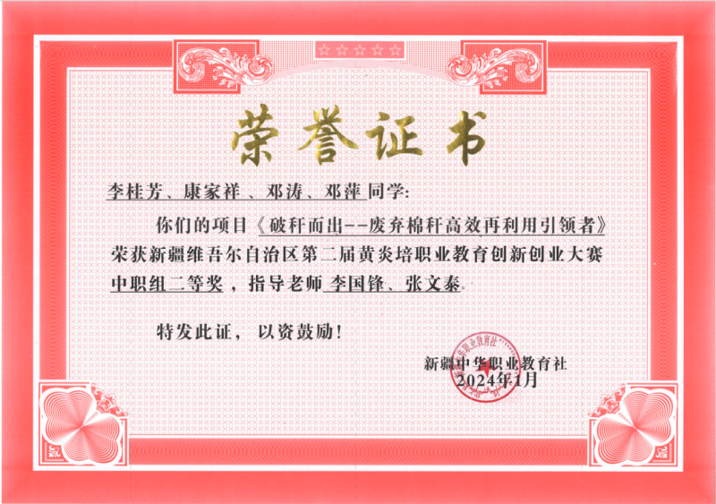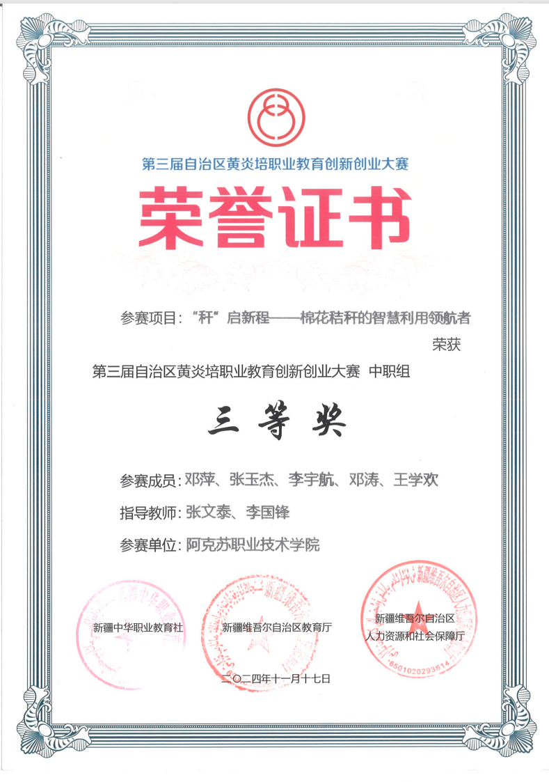 4 | 2024年 11月 | 第三届自治区黄炎培职业教育创新创业大赛:“秆”启新程——棉花秸秆的智慧利用领航者 | 自治区级