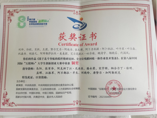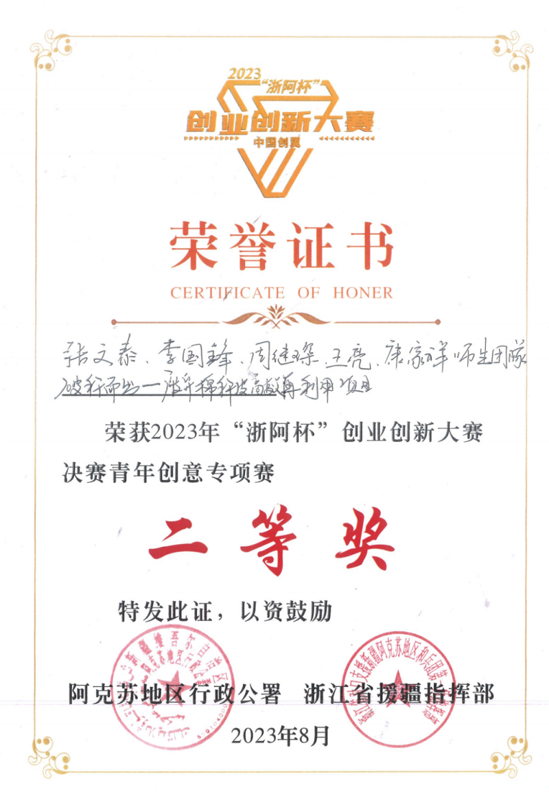 14 | 2023年 8月 | “浙阿杯”创业创新大赛决赛青年创意专项赛 | 阿克苏地区行政公署 | 二等奖 | 王亮、康家祥 | 张文泰 李国锋 周继琛 |