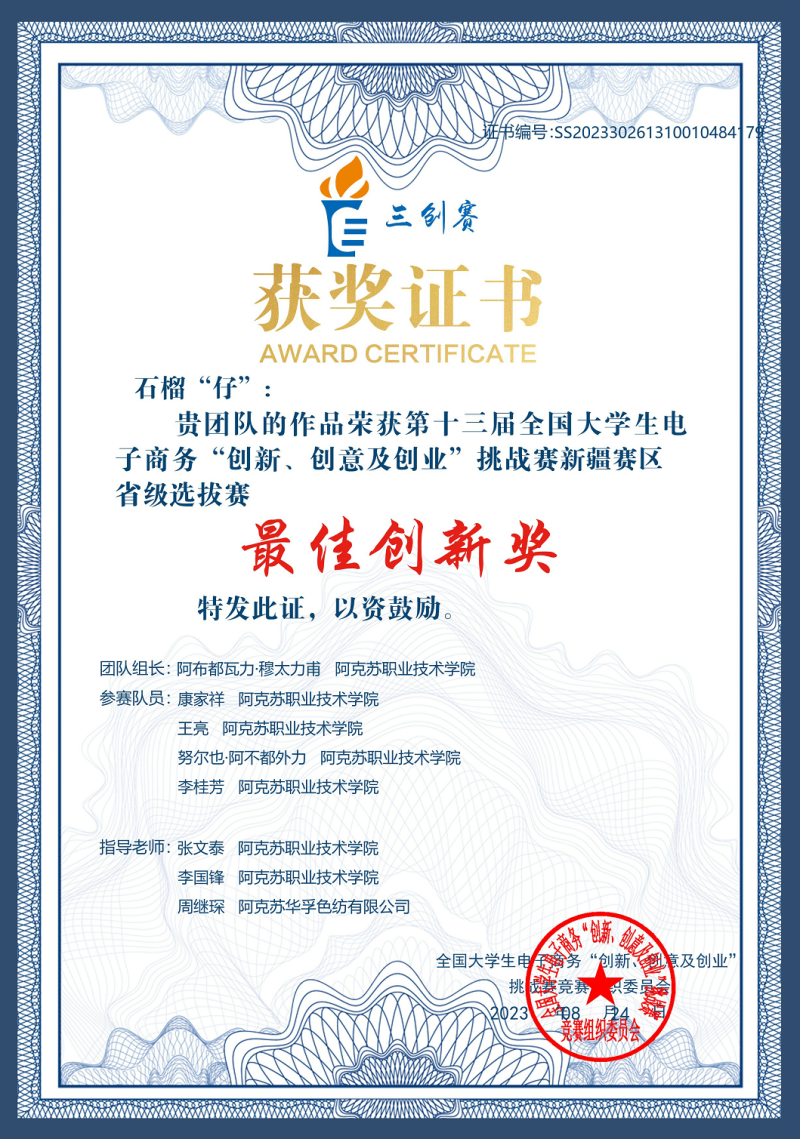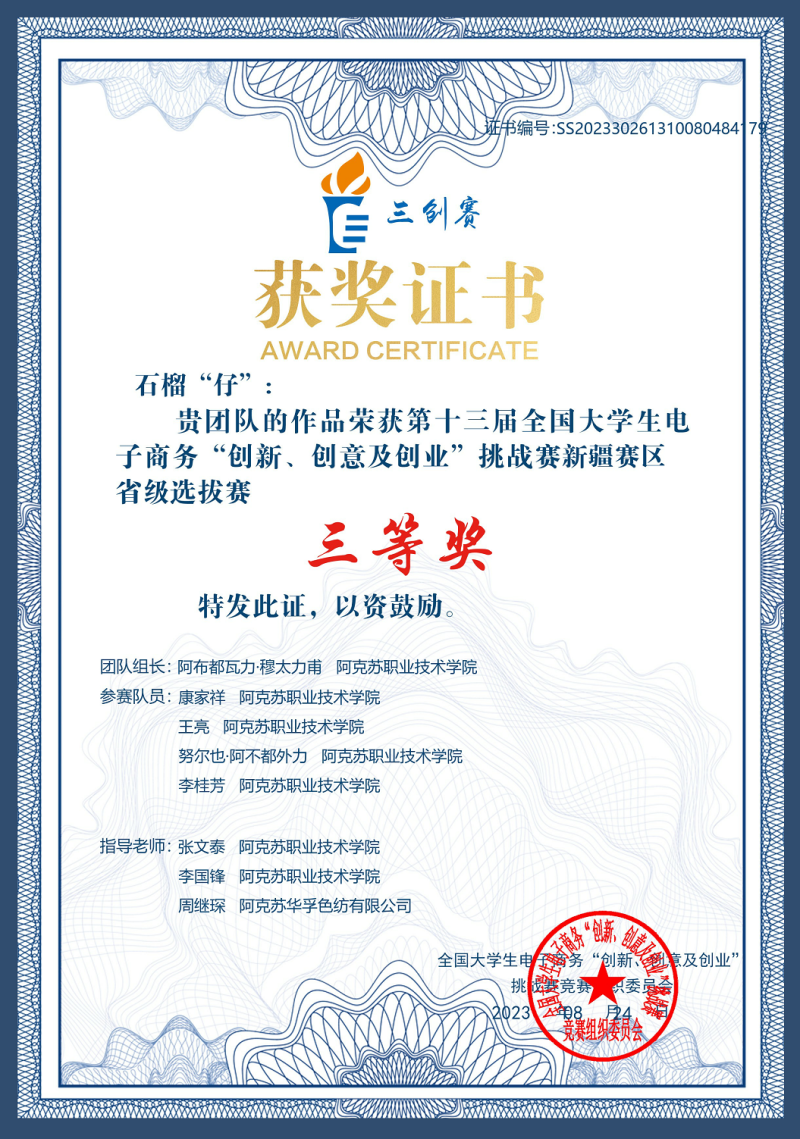 11 | 2023年 8月 | 第十三届全国大学生电子商务“创新、创意及创业”挑战赛新疆赛区省级选拔赛:石榴“仔” | 自治区级 | 最佳创新奖 | 阿布都瓦力·穆太力甫、康家祥、王亮、努尔也·阿不都外力、李桂芳 | 张文泰 李国锋 周继琛 |