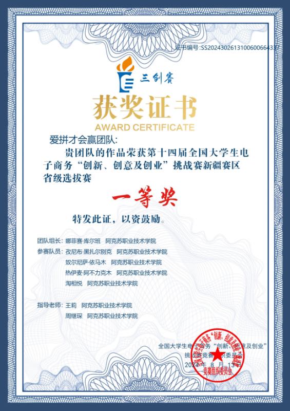 12 | 2024年 8月 | 第十四届全国大学生电子商务“创新、创意及创业”挑战赛新疆赛区省级选拔赛:爱拼才会赢团队 | 自治区级 | 一等奖 | 娜菲赛·库尔班 、孜尼布·黑扎尔别克、奴尔尼萨·依马木、热伊麦·阿不力克木、淘相悦 |
