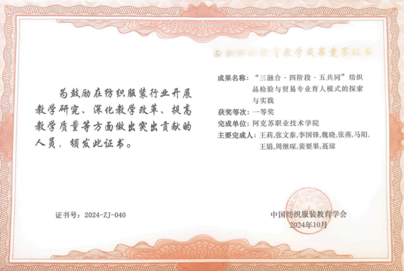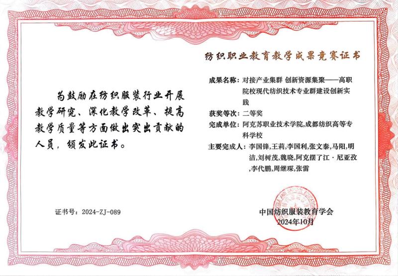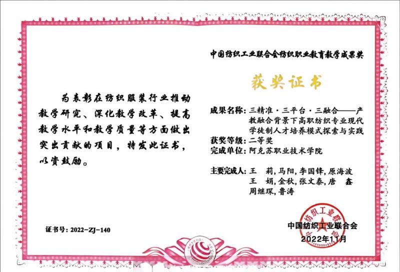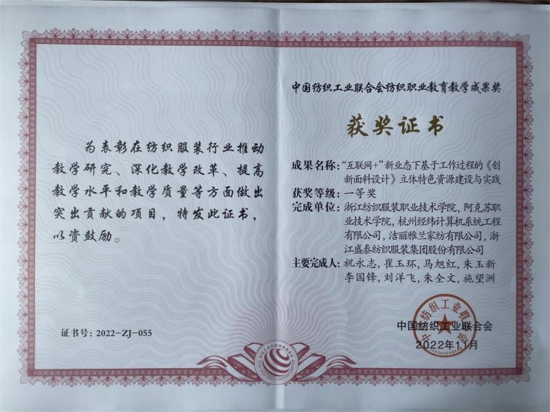 5 | “互联网+”新业态下基于工作过程的《创新面料设计》立体特色资源建设与实践 | 中国纺织工业联合会 | 2022年11月 | 一等奖 | 李国锋 | 参与 |