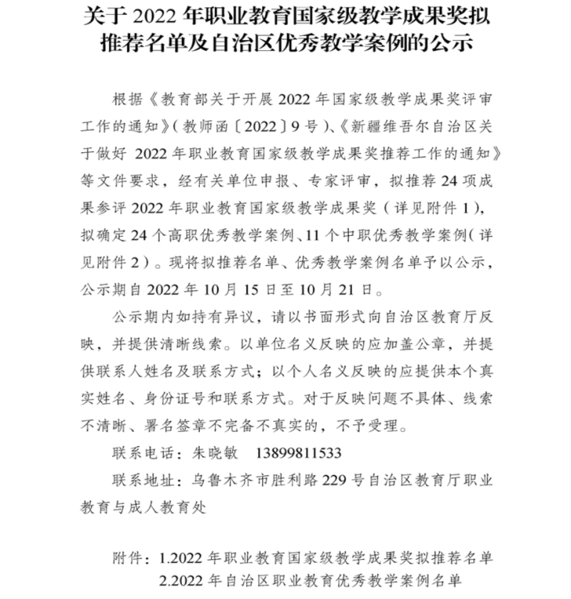 1.2022年职业教育国家级教学成果奖拟推荐名单及自治区优秀教学案例
