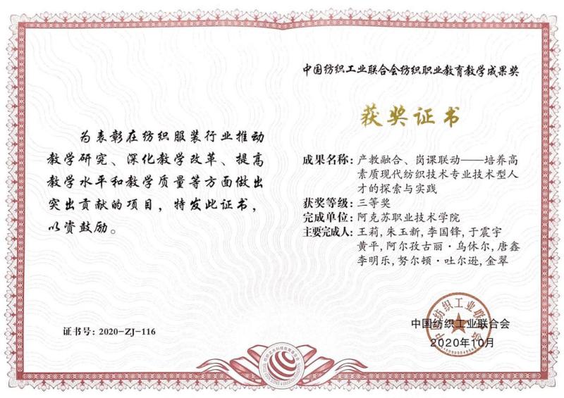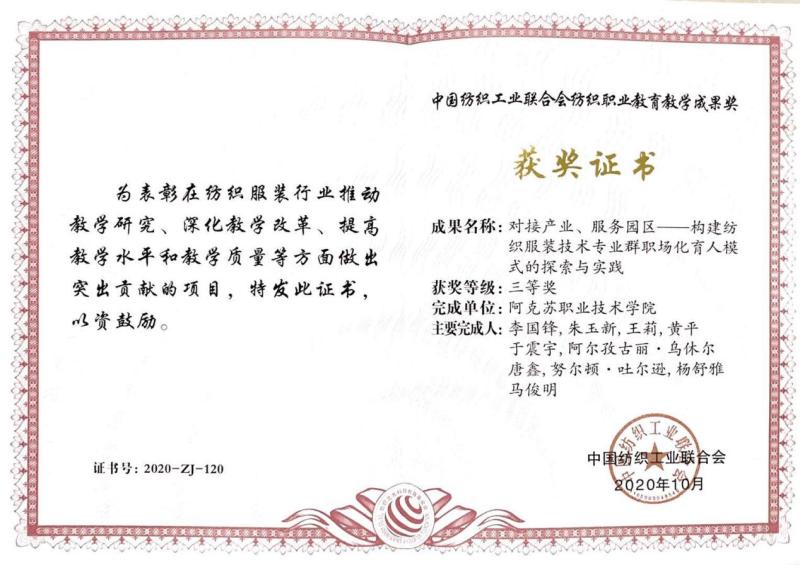对接产业、服务园区—构建纺织服装技术专业群职场化育人模式的探索与实践 | 中国纺织工业联合会 | 2020年10月 | 三等奖 | 李国锋 | 主持 |