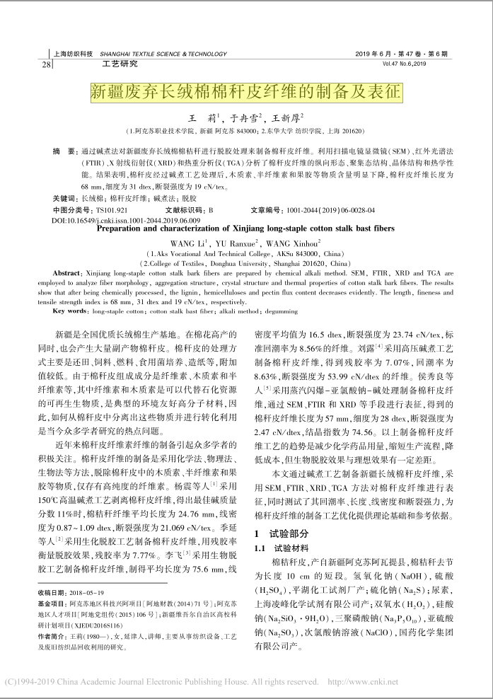 4.新疆废弃长绒棉棉秆皮纤维的制备及表征