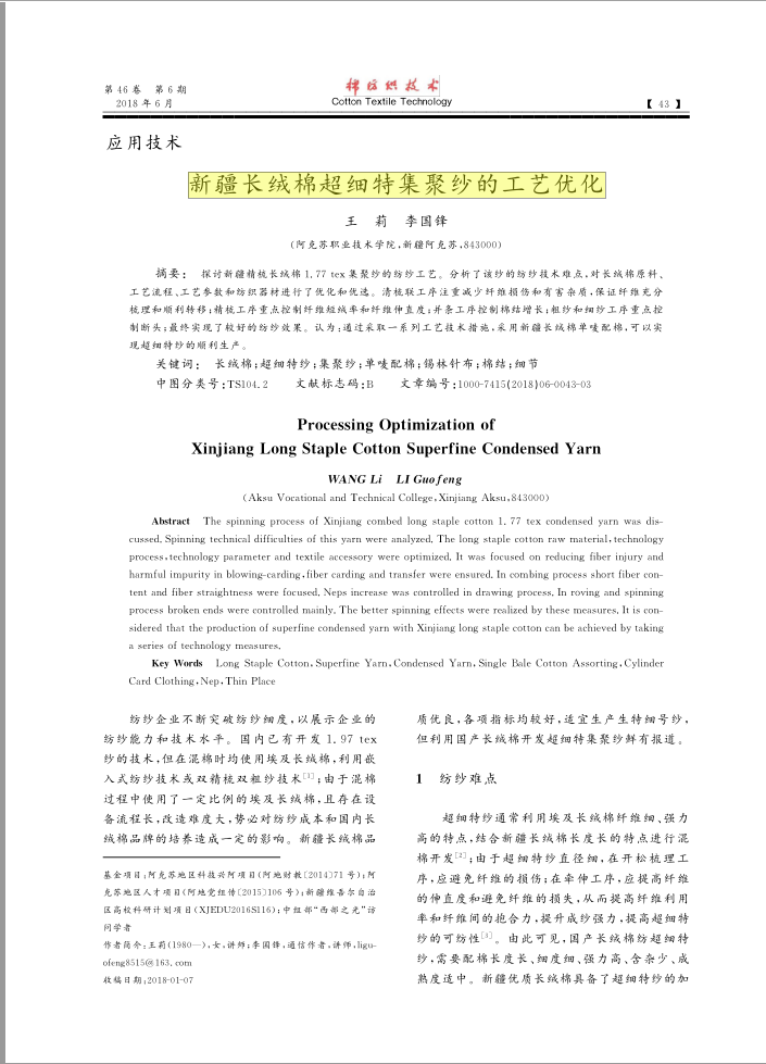 1.新疆长绒棉超细特集聚纱的工艺优化