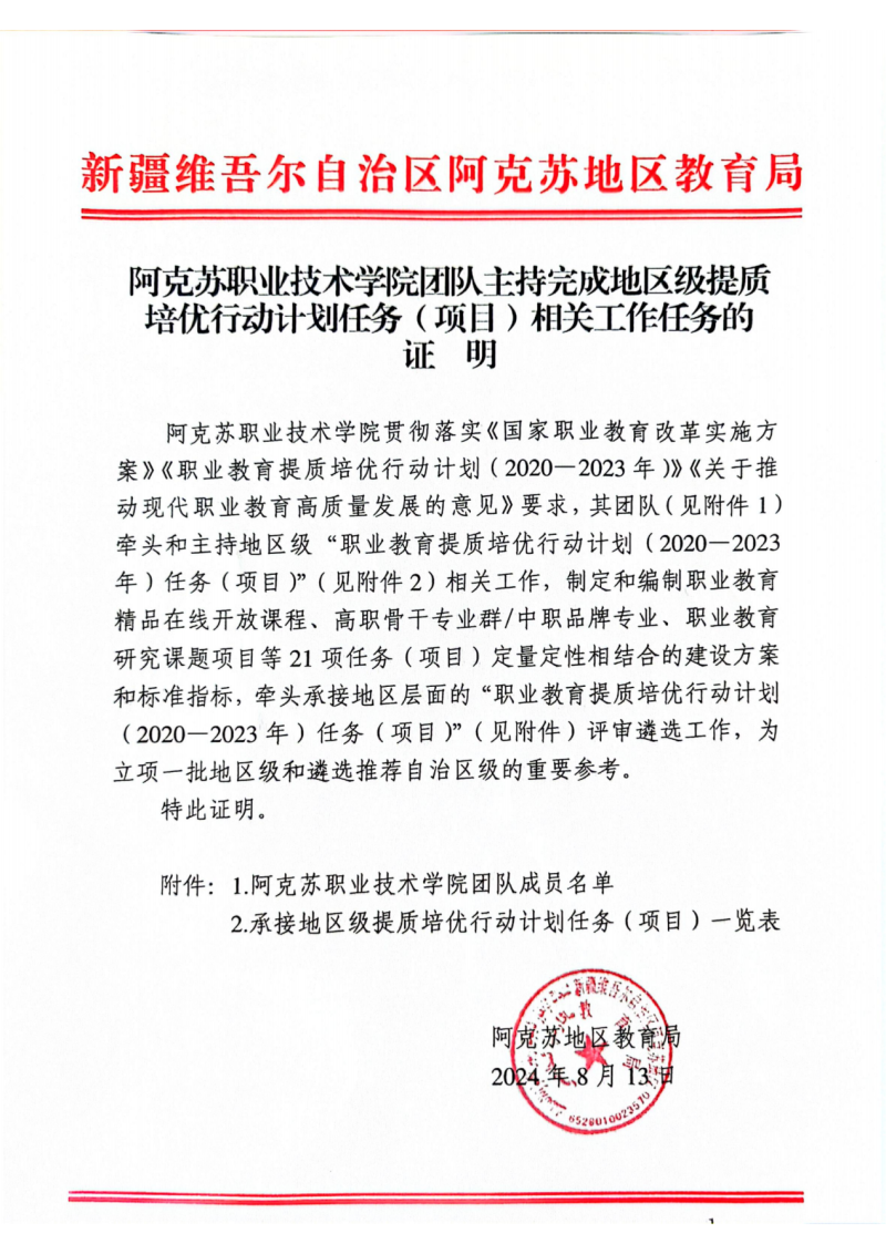 1.阿克苏职业技术学院团队主持完成地区级提质培优行动计划任务(项目)相关工作任务的证明